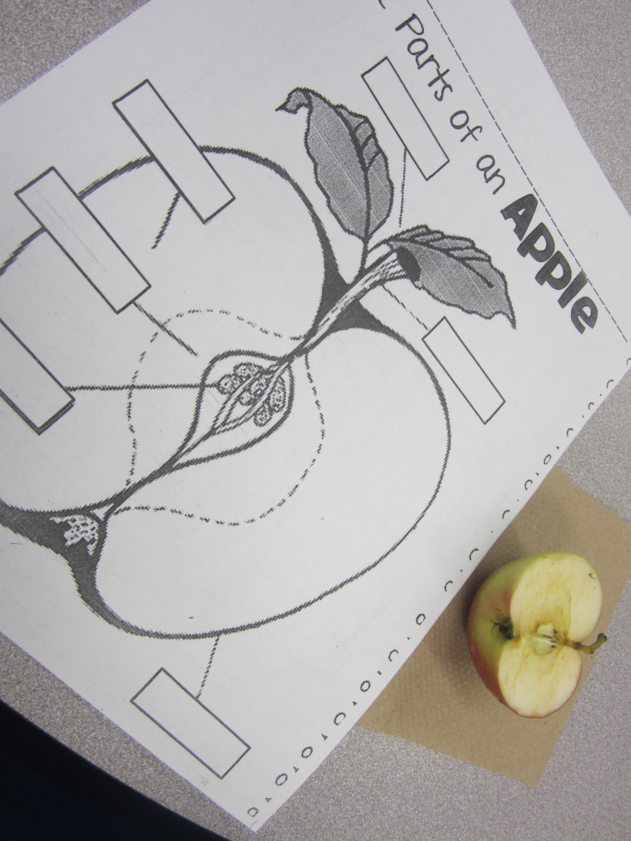 Whole apples, cut apples, green apples, red apples, sweet apples, sour apples, apple cores, stems, leaves, seeds; they were all dispersed around the science table for students to investigate over a period of time.