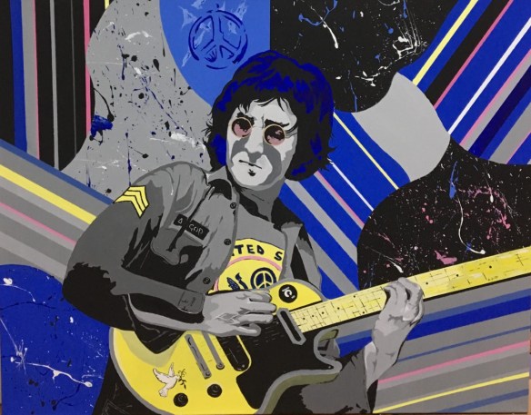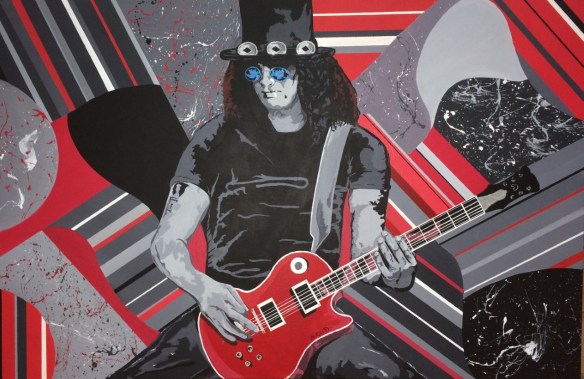 Painting people has always been most fascinating for me – to get the proportions and emotions correct is a challenge unto itself. Adding in the extra layer of painting famous musicians, has upped the challenge, one that I embrace. The energy of the rock music can be seen in my art, through the use of a fragmented background, that combines different art techniques. One might even argue that not only does this create movement, and even chaos, but a sense of rhythm and a visual depiction of the music itself.