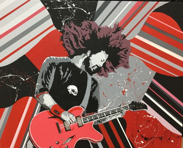 The music drives me and helps guide my art. What if I was listening to Beethoven or Mozart? Would the piece be different? Would the backgrounds change? Conversely, what if I was painting Beethoven or Mozart but listening to rock music – would that influence the look of the final piece. In time, this may be something I explore. For now, my intent is capturing the emotion of the moment; one where the musician is portrayed in their element – a performance based piece. Sharing my passion behind the music creates a whole different feel to the art – one in which I hope which the viewer can connect.